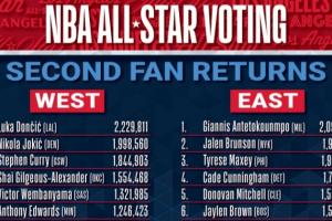 体育资讯1月7日讯 2026年NBA全明星球迷投票次轮结果出炉,东契奇领跑全联盟(票王),字母哥东部第1,约基奇、布伦森和马克西分列得票总排名前5,库里西部第3,詹姆斯升至西部第8。
