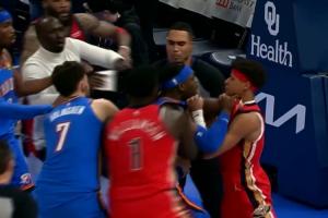 雷霆主场104-95战胜鹈鹕。比赛最后一攻,费尔斯上篮和多特有纠缠,多特推搡之后两人开启冲突,互相揪衣领,引发双方球员大冲突。