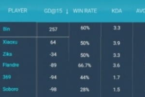 LPL第一赛段常规赛登峰组上单数据:前15经济差Bin第一257