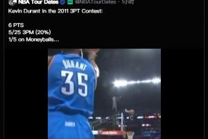 有网友转发了杜兰特2011年参加三分大赛的集锦,他当年总得分仅得到6分,25投5中(命中率20%)、花球5投1中。